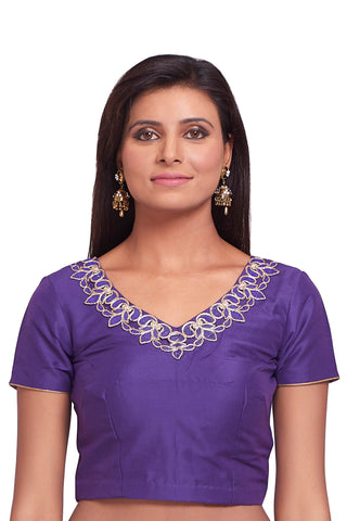 This beautiful purple color blouse with embroidery patch work on the neck in front as well as the back is a perfect everyday blouse. It has a deep V-neckline at the back along with tie-ups and latkans.